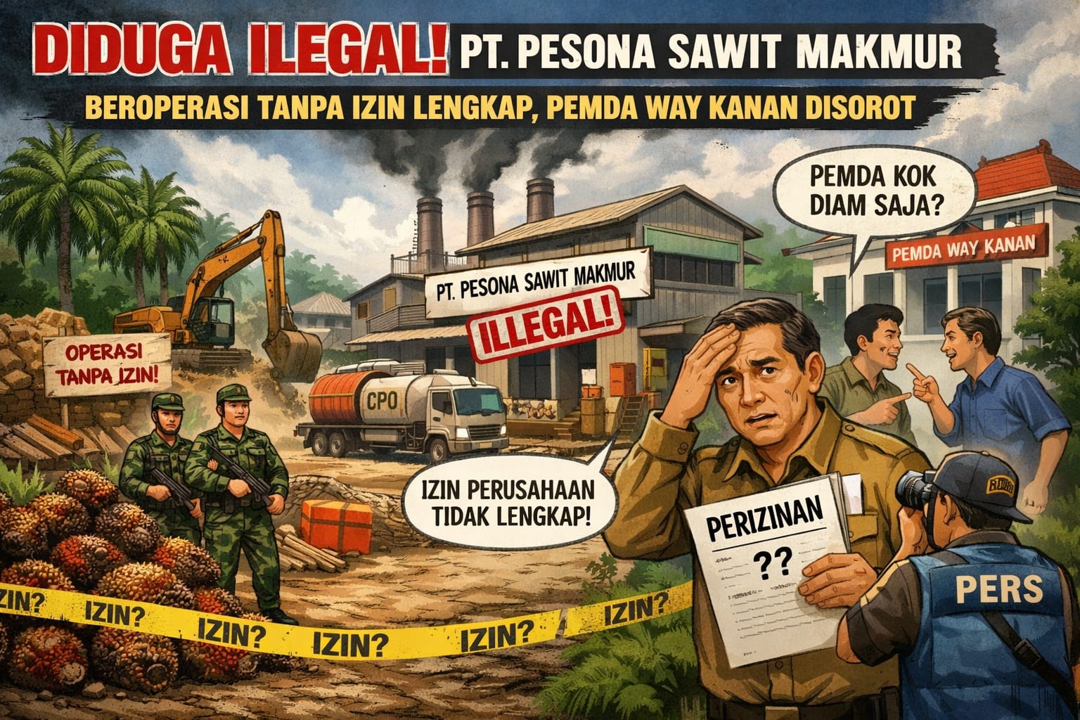 BLAMBANGAN UMPU (RWK) — Operasional PT. Pesona Sawit Makmur (PSM) di Kabupaten Way Kanan, Lampung, kian menuai sorotan tajam. Perusahaan pengolahan kelapa sawit tersebut diduga telah menjalankan aktivitas produksi tanpa mengantongi perizinan lengkap, memunculkan pertanyaan serius terkait penegakan hukum dan pengawasan pemerintah daerah.
