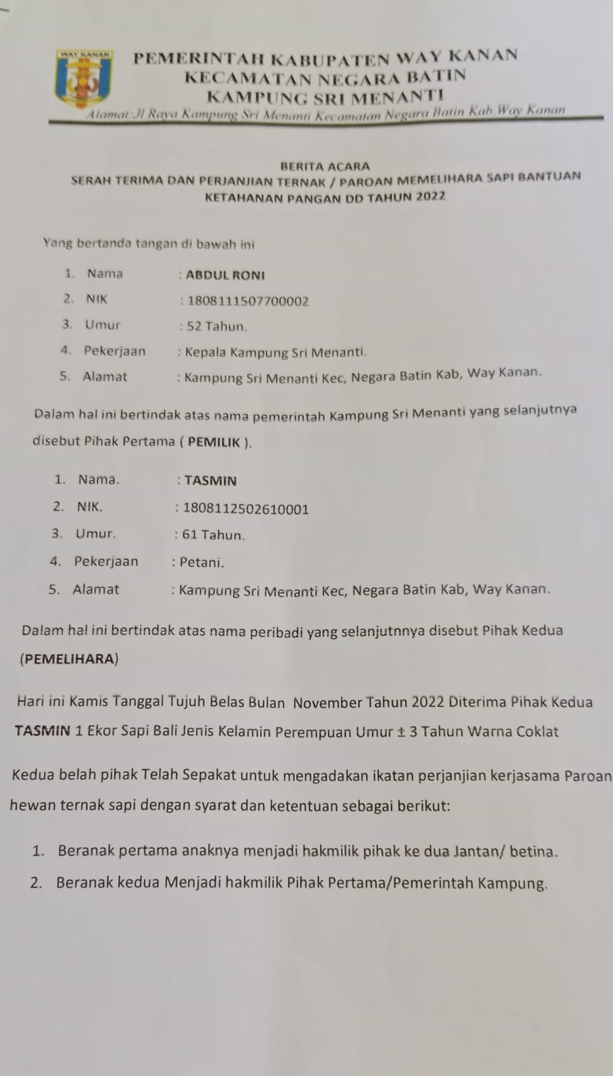 “Berdasarkan Dokumen Pemerintah Kampung Srimenanti dalam Berita Acara Serah Terima atau Perjanjian Pemeliharaan Hewan Ternak Sapi yang bersumber dari Program Ketahanan Pangan pemerintah Kampung Srimenanti Tahun Anggaran 2022 ditandatangani atau diserahkan kepada Tasmin mertua dari Hendrik atau kakek dari RD. Dalam berita acara tersebut juga masing-masing pihak saling mengikat dalam hal Hasil dan Resiko kerugian yang ditimbulkan atas Perjanjian Paroan tersebut. Dimana, Anak hasil kembang biak pertama dari indukan sapi tersebut adalah menjadi milik Tasmin lalu keduakalinya menjadi Pemilik Pemerintah Kampung. Sedangkan Indukan sapi tersebut mutlak adalah Milik Program Ketahanan Pangan kampung Srimenanti kecuali terdapat kendala alam atau mati dengan keadaan yang wajar dan dapat dibuktikan,” tuturnya.
