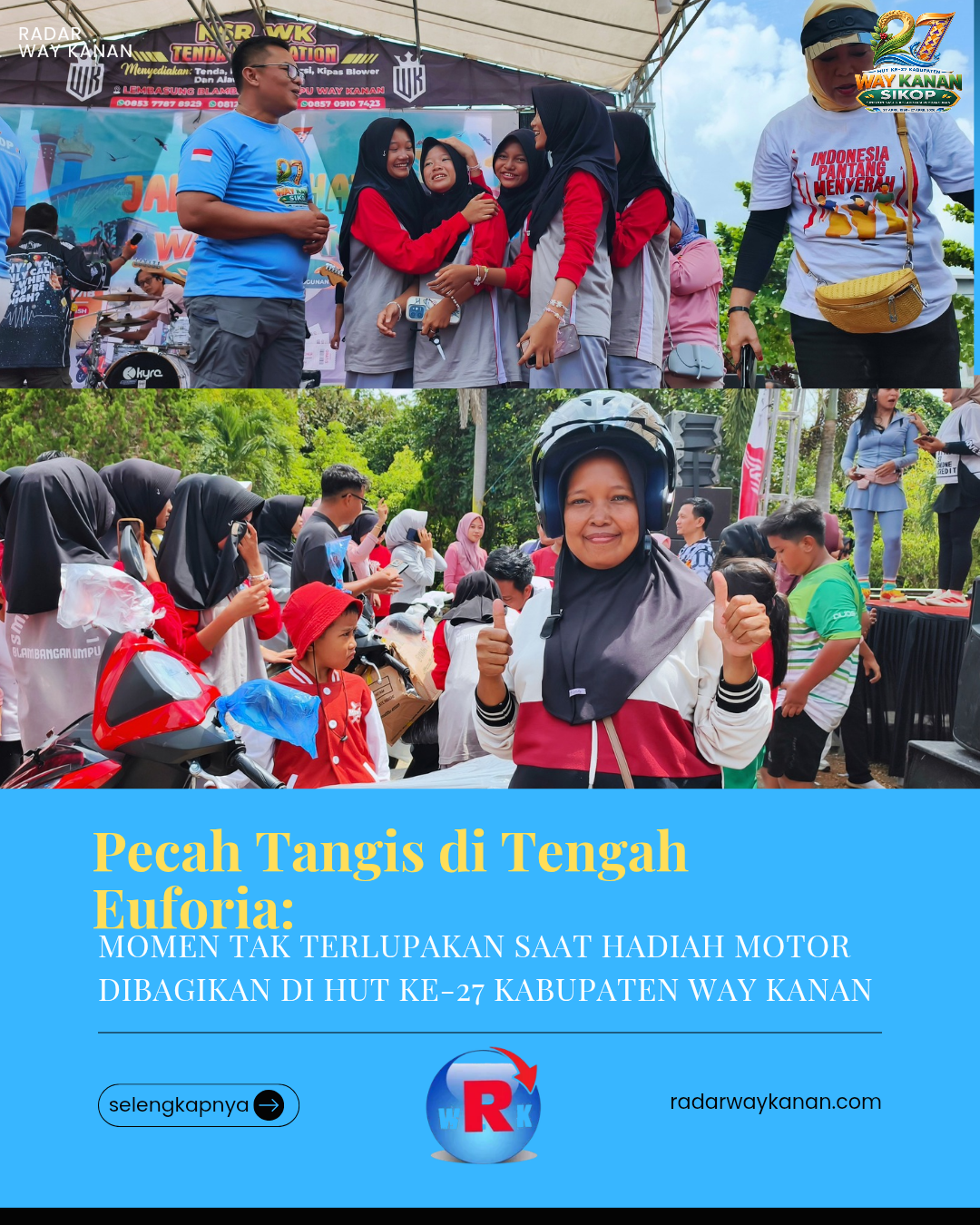 BLAMBANGAN UMPU (RWK) – Suasana haru dan penuh kebahagiaan mewarnai pembagian hadiah utama dalam kegiatan jalan sehat yang digelar untuk memperingati Hari Ulang Tahun (HUT) ke-27 Kabupaten Way Kanan, Kamis (23/4).