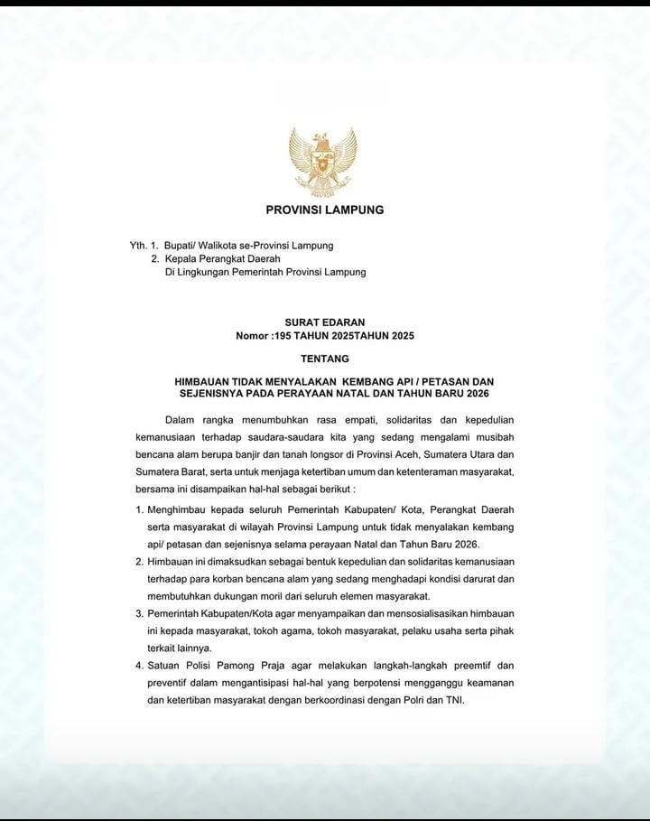 Pemerintah Provinsi Lampung mengeluarkan Surat Edaran Nomor 195 Tahun 2025 yang berisi himbauan kepada seluruh masyarakat untuk tidak menyalakan kembang api, petasan, atau sejenisnya selama perayaan Natal 2025 dan Tahun Baru 2026.