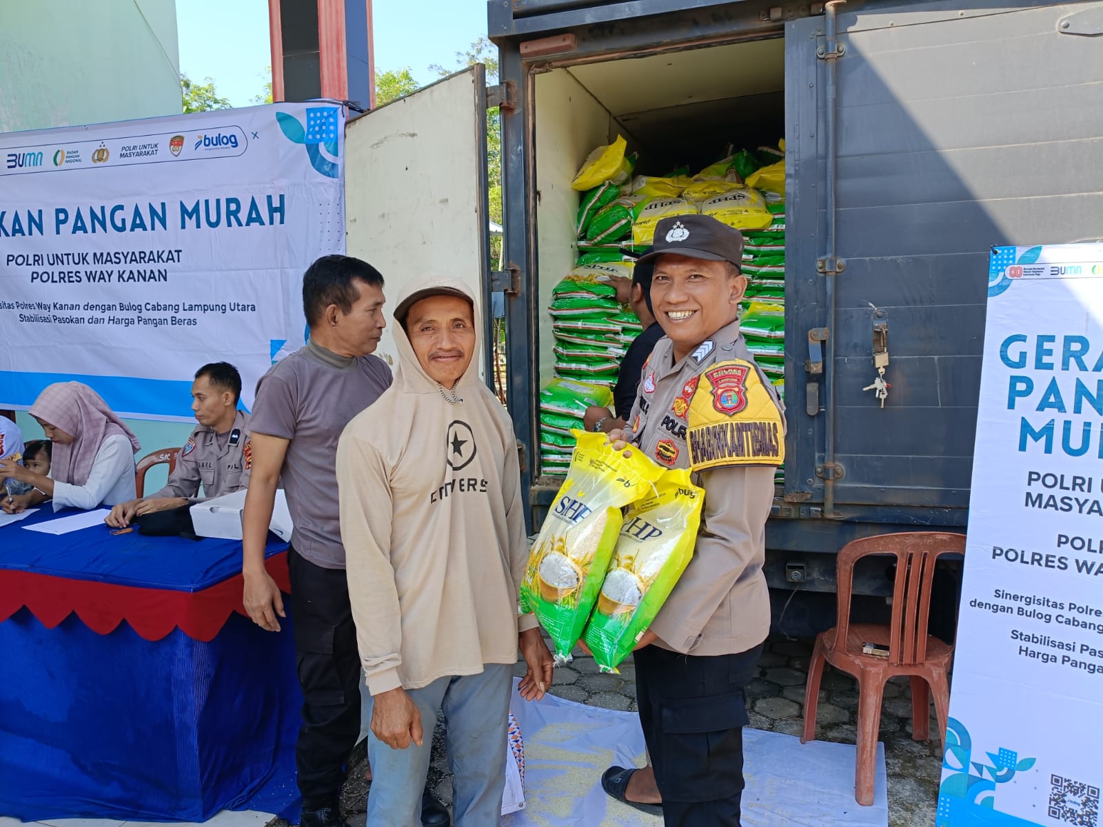 Kegiatan berlangsung di GSG. Kampung Sangkaran Bhakti Kecamatan Blambangan Umpu Kabupaten Way Kanan dibantu oleh Polsek Blambangan Umpu untuk mendistribusikan beras Subsidi SPHP 5 kilogram dengan target 2.800 kilogram.