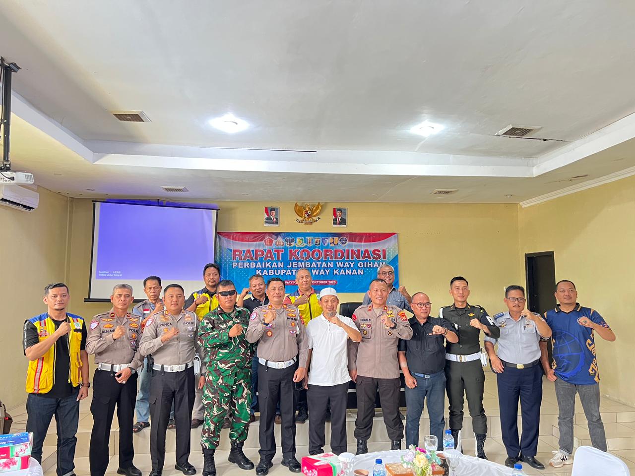 Blambangan Umpu.Radar Way Kana.Com.- olres Way Kanan Polda Lampung gelar rakor (Rapat Koordinasi ) Lintas Sektoral terkait perbaikan jembatan Way Giham Kampung Tanjung Raja Giham Kecamatan Blambangan Umpu Kabupaten Way Kanan bertempat di Aula Adhi Pradana Polres Way Kanan. Sabtu (11/10/2025).