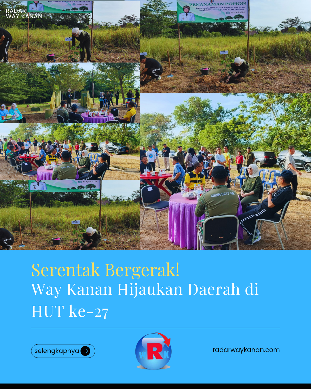BLAMBANGAN UMPU (RWK) — Dalam rangka memperingati hari jadi ke-27 Kabupaten Way Kanan, Pemerintah Kabupaten setempat menggelar aksi nyata peduli lingkungan melalui kegiatan Bersih-Bersih Lingkungan (Korve Gerakan ASRI) dan penanaman pohon secara serentak, Rabu (22/4/26).