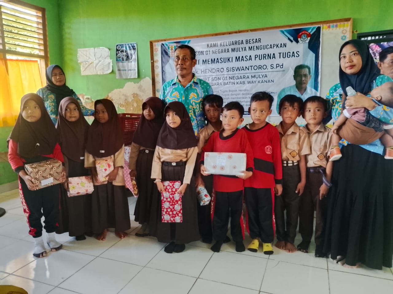 hari ini perpisahan untuk sang kepala sekolah yang dikenal memiliki dedikasi tinggi. Acara dihadiri oleh keluarga besar SDN Negara Mulya,dewan guru, staf, komite sekolah, wali murid, dan juga Kepala Kampung Negara Mulya Burhanudin yang datang khusus untuk memberikan apresiasi.