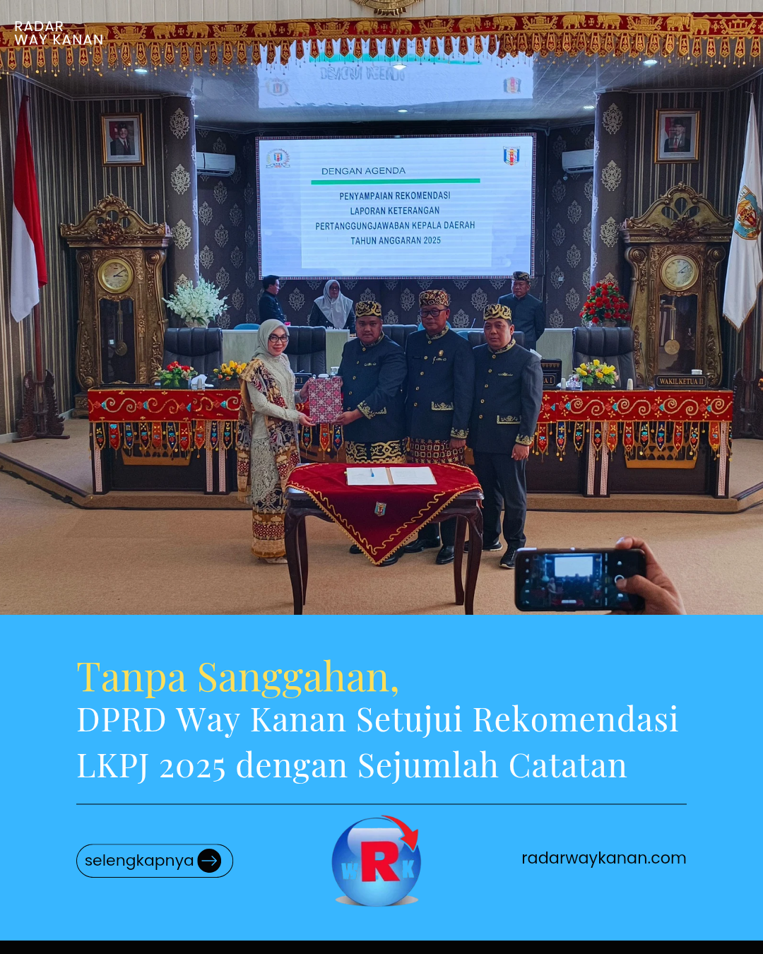 BLAMBANGAN UMPU (RWK) — Dewan Perwakilan Rakyat Daerah (DPRD) Kabupaten Way Kanan menggelar Rapat Paripurna dalam rangka penyampaian rekomendasi terhadap Laporan Keterangan Pertanggungjawaban (LKPJ) Kepala Daerah Tahun Anggaran 2025, Senin (27/4/2026).