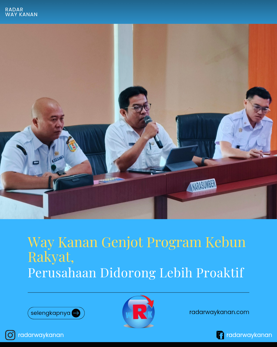 BLAMBANGAN UMPU (RWK) – Pemerintah terus mendorong percepatan program pemberdayaan masyarakat di sekitar kawasan perkebunan melalui kebijakan Fasilitasi Pembangunan Kebun Masyarakat (FPKMS). Komitmen tersebut kembali ditegaskan dalam rapat koordinasi yang digelar di Ruang Rapat Utama Pemerintah Kabupaten Way Kanan, Rabu (29/4/26).